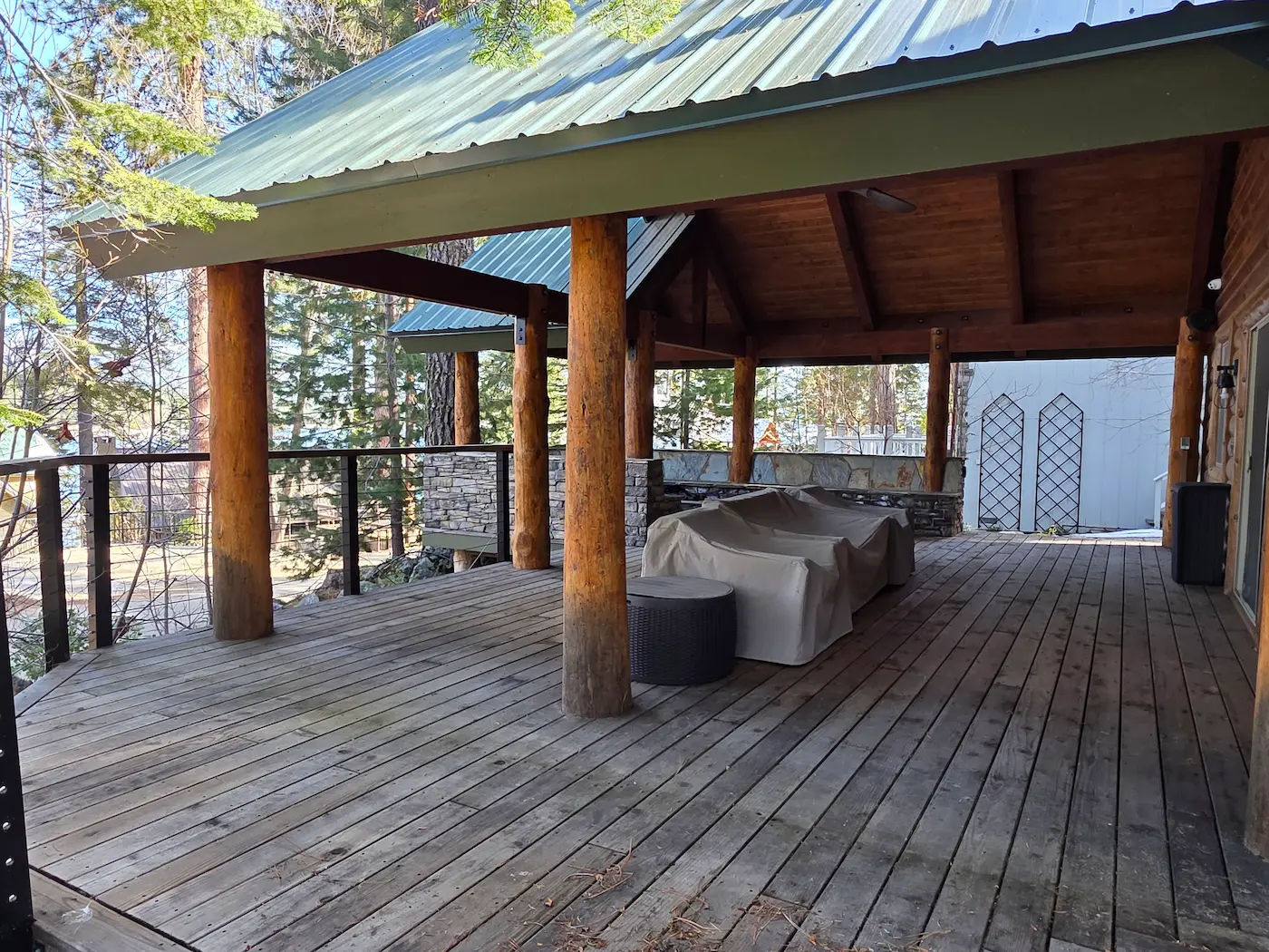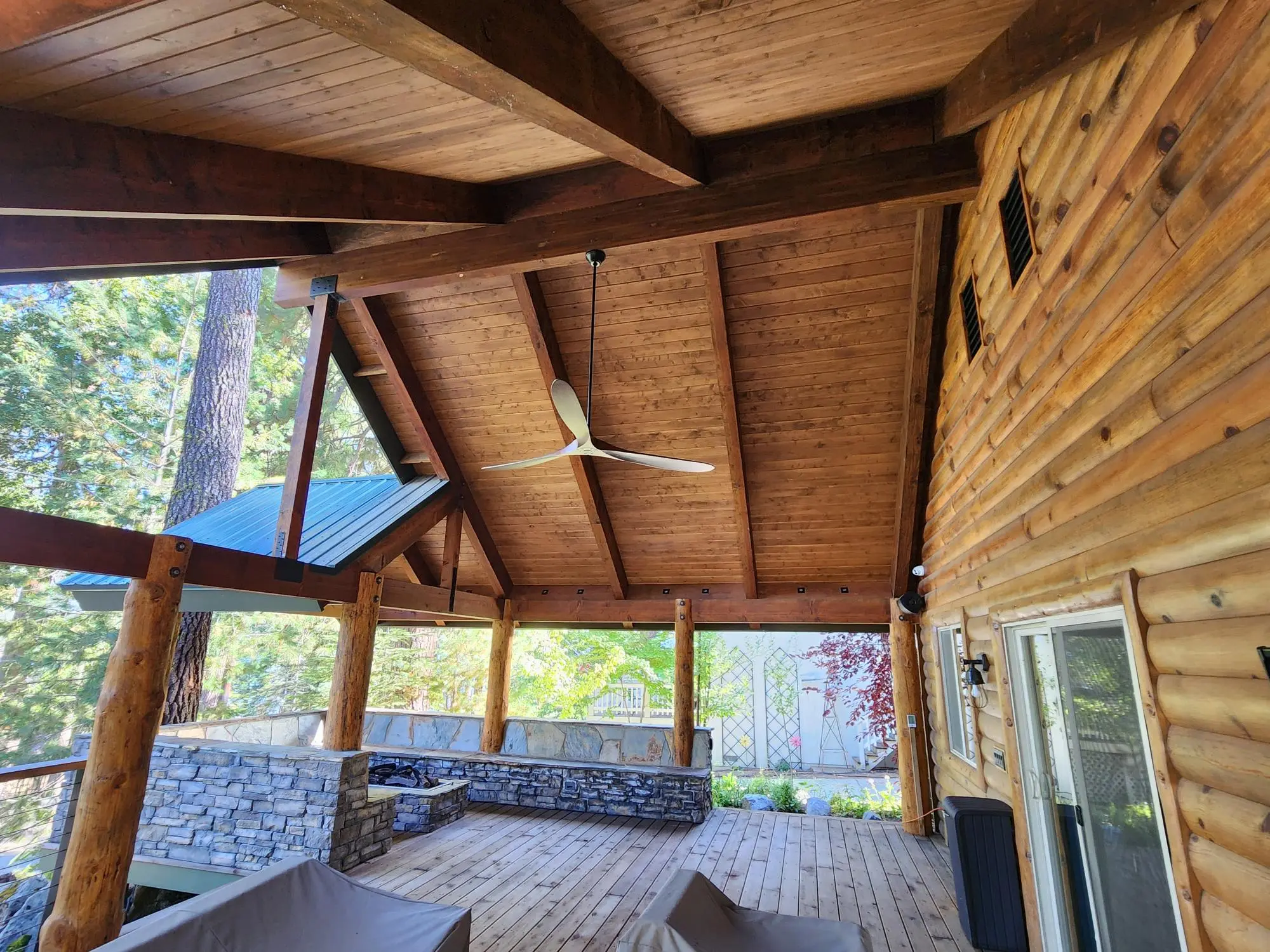The exterior is highlighted by a striking combination of large natural rock elements and rich log construction, creating a bold yet harmonious mountain-inspired aesthetic. The covered deck addition extends the living space outdoors, complete with an elegant fireplace, heated seating, and a mounted TV which is perfect for relaxing or entertaining year-round.