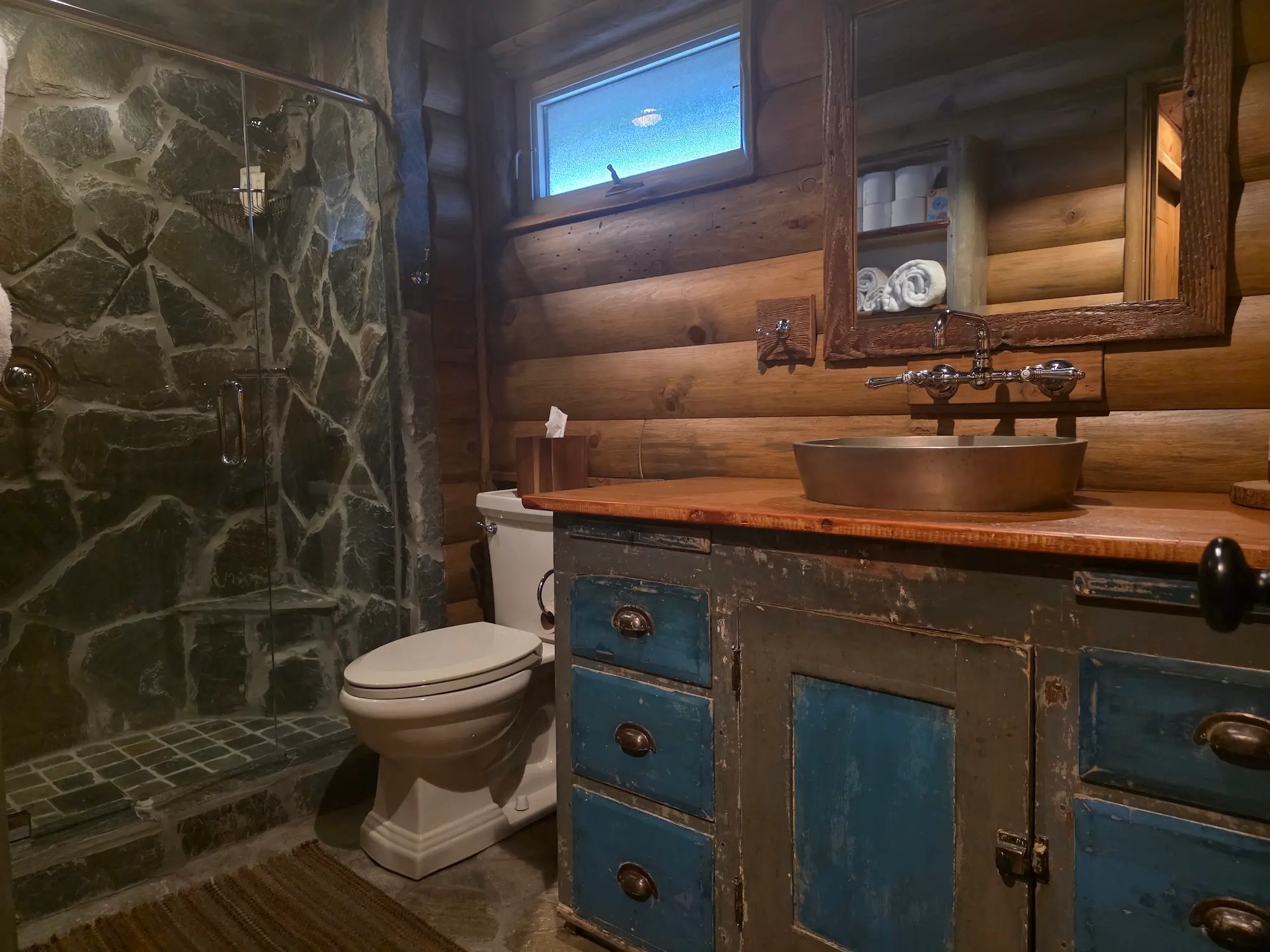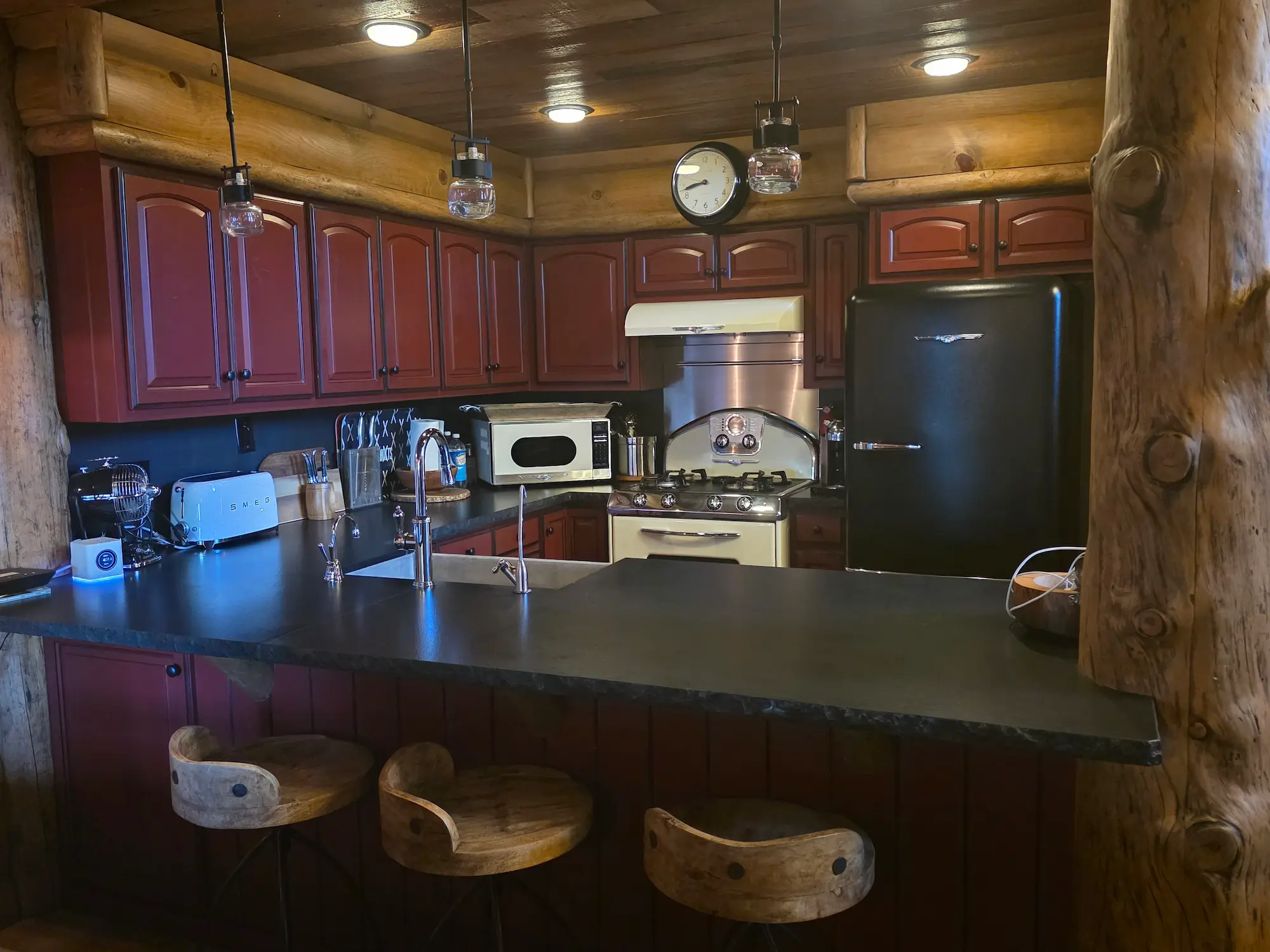 Inside, the rustic design continues with natural textures, warm tones, and carefully selected finishes that enhance the cabin feel while maintaining modern comfort. The kitchen and bathroom features new retro-style appliances and fixtures that add character and a touch of vintage charm, seamlessly integrated into the updated interior.